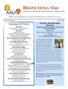 Today’s AAUW Carlisle is 100 members strong. Branch activities in the areas of public policy advocacy, higher education scholarships for area women, and research in the areas of equal pay, needed resources for caregivers, and access to child care is shared with community organizations and local, state and national legislators. In its 100th year, it is stronger than ever, and proudly proclaims “Feministic Shenanigans since 1924” as its 100th Anniversary slogan.
